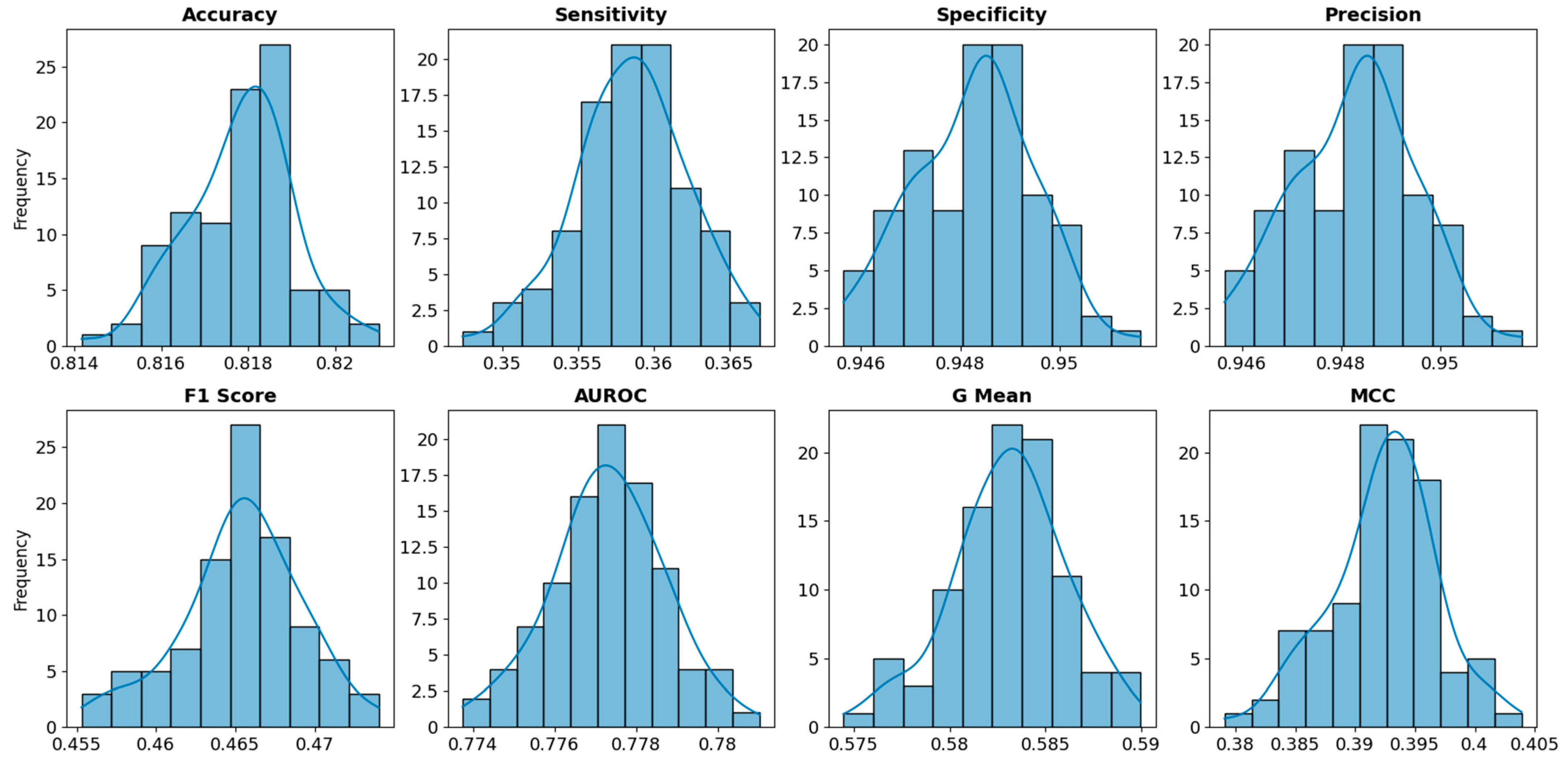 Figure 3 below presents the distribution of confusion matrix derived metrics across the 100 trained XGBoost models, while Table 3 shows the median values and the corresponding 95% confidence interval and median value for each metric. Similarly, the results show that model performance remains highly consistent across all models, confirming the limited effects of initial seeds randomization. The median accuracy of approximately 79.5% reflects strong predictive capability, comparable to benchmark findings reported in recent study (Bhandary and Ghosh 2025).