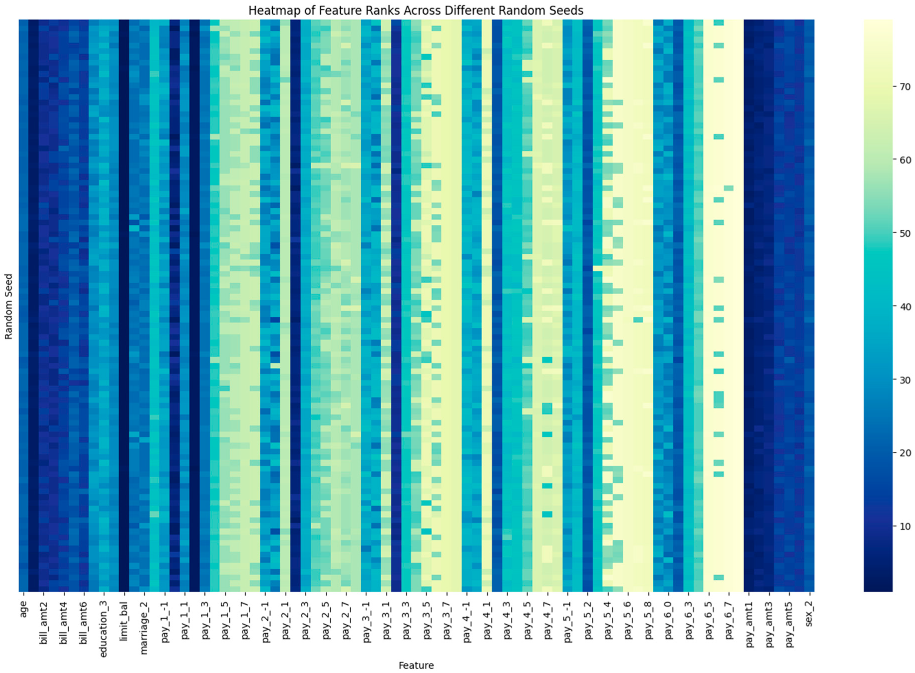 To further examine the stability pattern observed in the heatmap, we take a closer look at the features exhibiting the highest and lowest rank consistency across models. Table 4 and Table 5 summarize the rank distributions for the five features with the highest and lowest mean SHAP ranks, respectively. For instance, feature limit_bal (the amount of given credit in New Taiwan dollars) ranked first in 96 out of 100 models, and second in the remaining four, demonstrating exceptional stability and dominant importance across all models. Similarly, features with consistently low predictive contributions, such as pay_6_8 (an indicator of eight-month payment delays as of April 2005), appear at the boom of the rankings across all models. These results confirm that both highly predictive and negligible variables maintain strong rank stability across different model initializations.