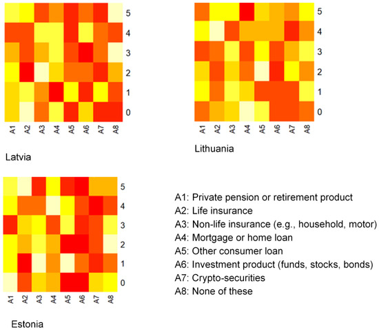 The relationships between financial product ownership and RR varied across the Baltic countries as follows.