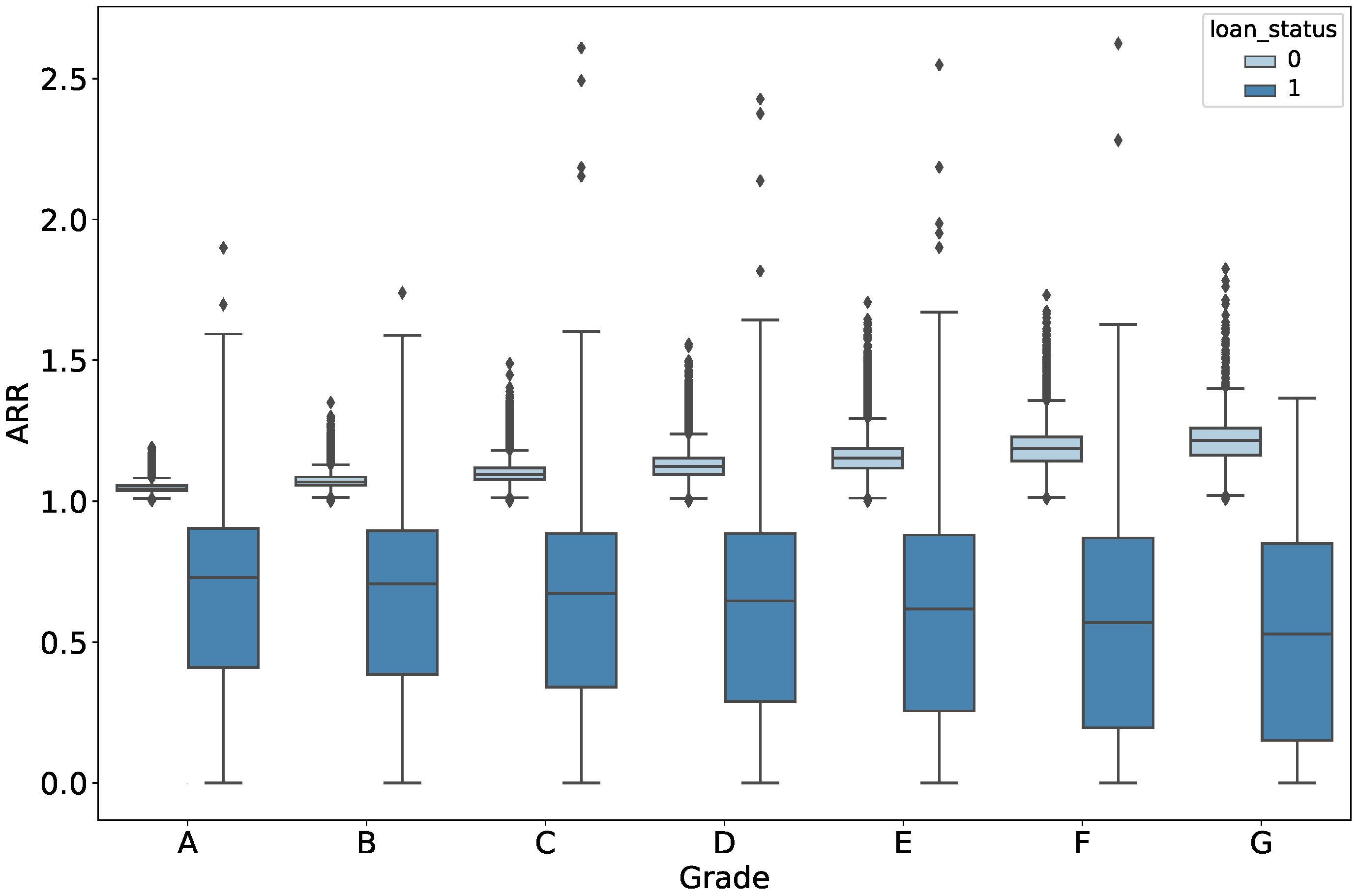 The Lending Club has segmented the loans into seven different grades, including A, B, C, D, E, F, and G, and nominal interest rates are assigned accordingly. Lower interest rates are allocated to Grade A since it is considered the safest grade, while higher interest rates are allocated to Grade G loans. Figure 1 shows the boxplot of ARR across different grades segmented by loan_status. It is observed that “safer” loans are not always “more profitable”, making it crucial to evaluate loans simultaneously from both the credit and the profit perspectives.