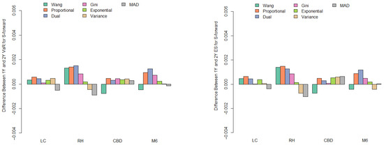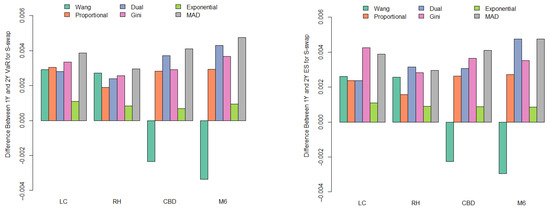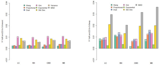 The plot of values obtained for a 2-year 99.5% VaR and ES for S-forwards (left) and S-swap (right). The solid color represents the VaR, while the transparent color represents the ES.