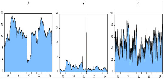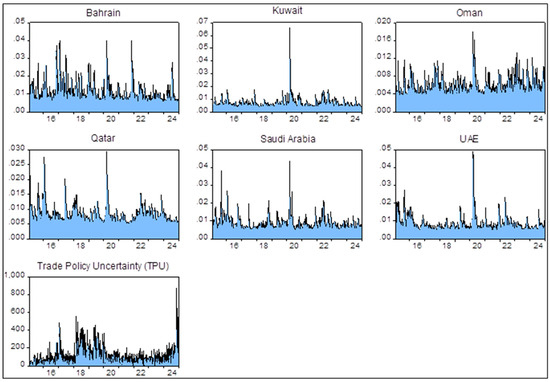 Figure 1 presents the conditional volatility series of Sharia-compliant equity market returns for the Gulf Cooperation Council (GCC) member economies—Bahrain, Oman, Kuwait, Saudi Arabia, Qatar, and the UAE—estimated using the GARCH (1,1) model with a Generalized Error Distribution (GED). The GARCH (1,1) model with GED was chosen over the GARCH (1,1) model with a student’s t distribution due to its higher log-likelihood values and lower Akaike Information Criterion (AIC), Schwarz Criterion (SC), and Hannan–Quinn (HQ) values (see Table 2). Figure A1 also illustrates the conditional volatility series of Islamic stock returns for GCC member economies estimated using the GARCH (1,1) model with a student’s t distribution, revealing only negligible differences with the conditional volatility series estimated through GARCH (1,1) with GED (see Figure 1). Consequently, the estimation of shock spillovers from Trade Policy Uncertainty (TPU) to the conditional volatility of GCC equity markets remains robust regardless of the choice of distribution used in the GARCH (1,1) model for estimating conditional volatility series in GCC member economies.