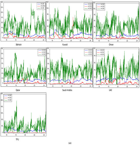 In the existing literature, Chatziantoniou et al. (2021) explored quantile-domain interactions between global developed forex markets and interest rate swaps, focusing only on bearish (τ = 0.05), bullish (τ = 0.95), and moderate (τ = 0.5) quantiles using the quantile-domain VAR approach. Similarly, Sheikh et al. (2024) examined extreme quantile-domain interactions between conventional, sustainable, and Sharia-compliant financial market returns in Australia and global uncertainties, also considering bearish (τ = 0.05), moderate (τ = 0.5), and bullish (τ = 0.95) quantiles through the QVAR approach. Moreover, Cunado et al. (2023) analyzed the quantile-domain shock-transmission mechanism between the energy market and precious metals, selecting only three quantiles—bearish (τ = 0.05), bullish (τ = 0.95), and moderate (τ = 0.5)—using the QVAR-based connectedness approach. Building upon these studies, we also investigate the extreme quantile-domain shock-transmission mechanism between GCC stock market volatility and TPU across bearish (τ = 0.05), bullish (τ = 0.95), and moderate (τ = 0.5) quantiles using the QVAR approach. Moreover, our selection of only three quantiles, i.e., bearish (τ = 0.05), bullish (τ = 0.95), and moderate (τ = 0.5) is in line with Iacopini et al. (2023).