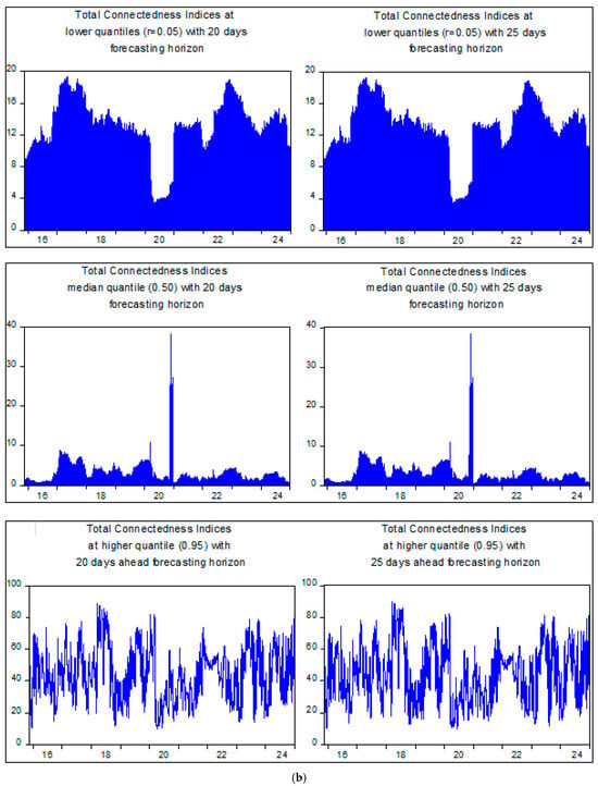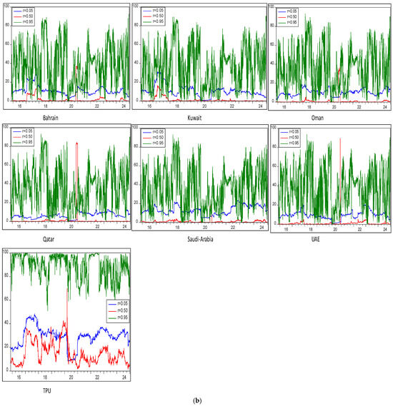 Figure 4b shows that the aggregated value of the Total Connectedness Index (TCI) between GCC stock market volatility and TPU, driven by the spillover of shocks within the entire QVAR system across bearish, bullish, and moderate quantiles, remains stable at different H-step-ahead forecasting horizons (20 and 25). This stability of the TCI across different forecasting horizons suggests that the quantile-domain shock-transmission mechanism between TPU and GCC stock volatility is fundamentally stable rather than a transient anomaly. Moreover, it underscores the accuracy of shock-spillover forecasts. The stability of the TCI provides important insights for investors and policymakers, indicating that trade policy uncertainty continuously and asymmetrically transmits volatility shocks to GCC stock markets over various time periods. This implies that rather than treating TPU as a short-lived market shock, long-term investing and hedging strategies should consider it a persistent risk factor. TPU shocks likely exert a consistent influence on GCC stock markets under different market conditions and across various forecasting horizons. This finding is significant because it suggests that, given TPU’s consistent impact, policy decisions and risk-management strategies do not need to be closely tailored to specific forecasting horizons. However, investors should consider bearish, bullish, and moderate equity market volatility conditions when hedging TPU-related risks in the GCC financial system. Lastly, the interconnectivity estimations remain robust and are not unduly affected by the choice of forecasting horizon (H = 20 or H = 25), further reinforcing the stability of the TCI.