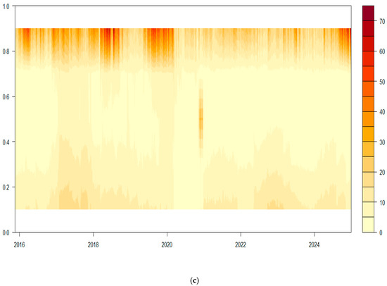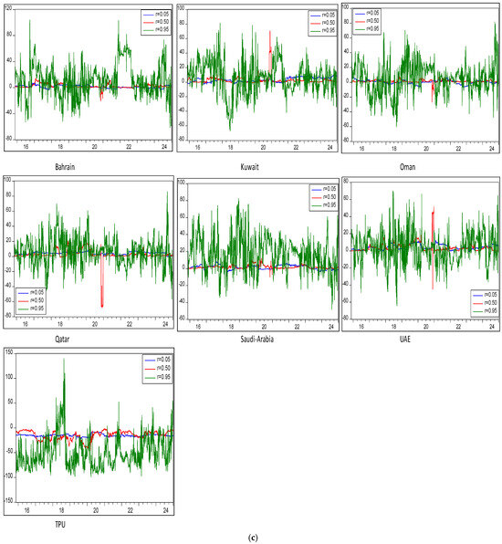 Table 5 and Figure 2 show that overall shock transmission between TPU and GCC stock market conditional volatility series is higher at extreme upper and lower quantiles (τ = 0.05, 0.95) compared to the median quantile (τ = 0.5). Furthermore, we explore the overall quantile domain shock transmission between TPU and GCC stock market conditional volatility across bullish (τ = 0.80, 0.85, and 0.90), bearish (τ = 0.20, 0.15, and 0.10), and moderate (τ = 0.55, 0.60, and 0.45) quantiles (see Figure 3c). Figure 4c represents a heat map illustrating the quantile domain shock transmission, where intensified heat at the extreme higher quantiles (τ = 0.80, 0.85, and 0.90) indicates stronger shock transmission and connectedness between TPU and GCC stock market conditional volatility. Furthermore, Table 5 and Figure 2 also show that overall shock transmission and connectedness between TPU and GCC stock market conditional volatility is weaker at the moderate quantile (τ = 0.5) compared to bearish and bullish quantiles (τ = 0.95). Additionally, Figure 4c shows lighter and faded heat waves at the median quantiles (τ = 0.55, 0.60, and 0.45), indicating very low intensity and weak shock-transmission mechanisms at median quantiles compared to the intensified heat waves at the bullish quantiles (τ = 0.80, 0.85, and 0.90). Furthermore, Table 5 and Figure 2 show that overall shock transmission between TPU and GCC stock market conditional volatility is lower at the bearish quantile (τ = 0.05) compared to the bullish quantile (τ = 0.95), but stronger than at the moderate quantile (τ = 0.5). Meanwhile, Figure 3c shows that the heat waves observed at the lower quantiles (τ = 0.20, 0.15, and 0.10) are denser compared to the faded heat waves at the median quantiles (τ = 0.55, 0.60, and 0.45). This suggests that overall shock transmission from TPU to the GCC stock market conditional volatility remains higher at the upper quantiles compared to bearish and median quantiles and is not sensitive to the selection of quantile levels.