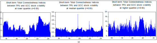 Figure 4a shows that the overall quantile domain Total Connectedness Index (TCI) between GCC stock market volatility and TPU due to the aggregated value of the spillover of shocks within the entire QVAR system across bearish, bullish, and moderate quantiles remain stable at different rolling windows (250 and 200). Rolling windows in QVAR with “Extended Joint” are used in this article and in the domain of financial economies to record dynamic quantile domain interactions between TPU and GCC stock market conditional volatility across time. The calculation of shock transmission and connectedness metrics between the variables, however, could be impacted by selecting a different window length (Suleman et al. 2023a). Although it may miss abrupt structural changes, a longer rolling window (e.g., 250) smooths out short-term variations and produces more stable estimates. More localized dynamics are captured with a shorter rolling window (e.g., 200), but because sample sizes are lower, noise may be introduced. The transmission mechanism between TPU and GCC volatility across bearish, bullish, and moderate quantiles exhibit similarity and consistency across both shorter and longer rolling windows (200 and 250), as shown in Figure 4a. This demonstrates that the quantile domain connectedness link between GCC stock markets and TPU is a structural dynamic in the data rather than an artifact of the window size that was selected.