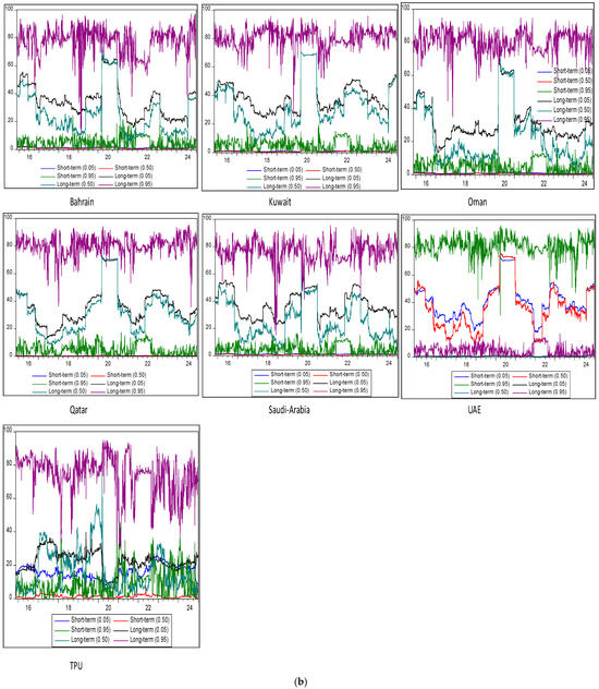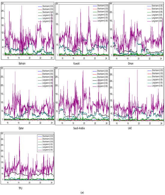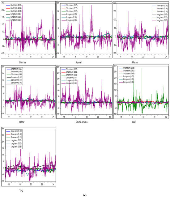 Additionally, unlike MS-VAR or TVAR, which typically partition data into discrete regimes, QVAR with the Frequency-domain connectedness approach provides a continuous view of the dynamics from the center to the tails of the distribution across varied investment horizon (long- and short-term). This enables a more nuanced understanding of how extreme events (e.g., market crashes or booms) impact volatility spillovers across varied quantiles () and investment horizons (long- and short-term). Therefore, returns on GCC equity markets frequently show asymmetry and large tails. Since QVAR does not rely on the normalcy assumption and may adjust to different tail densities, its quantile-based estimate makes it inherently resistant to such traits. On the other hand, even while MS-VAR and TVAR can simulate nonlinear behavior, they can have trouble capturing the entire spectrum of tail behaviors without the need for complicated model structures or further modifications. Moreover, by estimating effects at various quantiles, QVAR with “Extended Joint” and “Frequency”-domain-connectedness models are intended to study relationships over the whole conditional distribution and across different investment horizons. Unlike the MS-VAR and TVAR approaches, this implies that without imposing the data into arbitrary regimes, they may show how extreme events (tail behaviors) vary from more normal (central) settings. The continuous character of financial market dynamics may be oversimplified by MS-VAR or TVAR approaches, which divide the data into discrete regimes or segments based on threshold values.