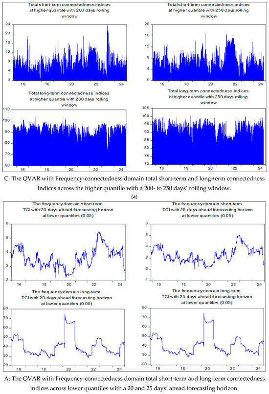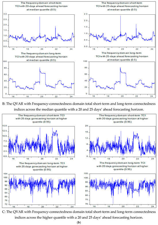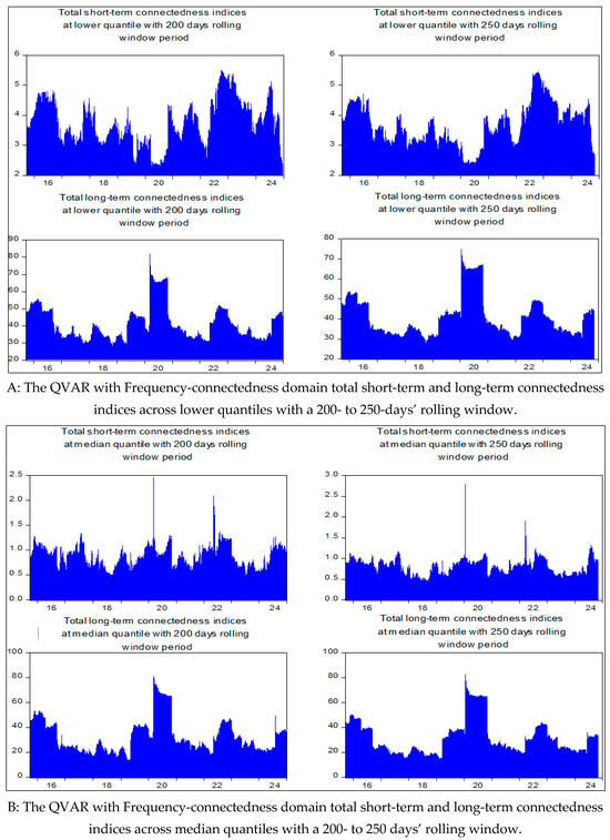 4.3. Frequency-Domain QVAR of Chatziantoniou et al. (2022) for Short- and Long-Term Connectedness Under Extreme and Medium Market Conditions