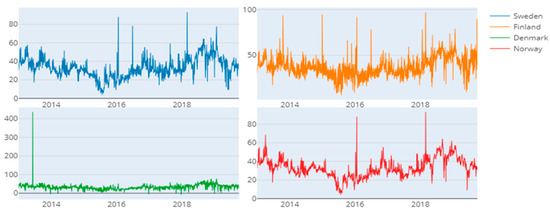 The Nordic Power Market website provided the information for this study. Power pricing information is reported using this database on an intraday, daily, quarterly, and annual basis. Since GARCH-type models are best suited for daily frequency, we take into account daily spot prices (Cifter 2013) and Figure 1 exhibit daily spot prices. Our sample period was inclusive from 1 January 2013 to 30 November 2019.