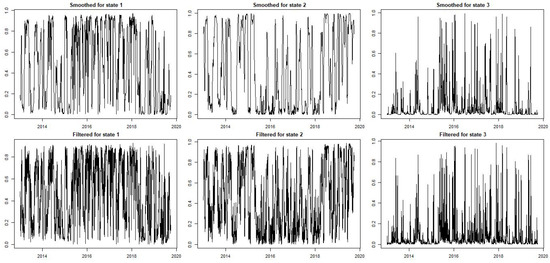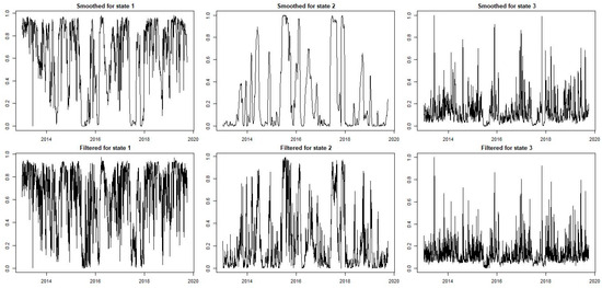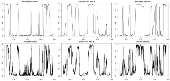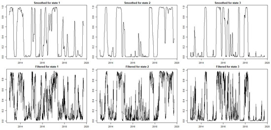 Figure 5 displays the calculated smoothed probability and filtered conditional volatilities for the instance of Norway using the GJR-GARCH (1,1,1). As we saw in the findings, the filtered probabilities of the operation in regime 1 are fast-growing, while the smoothed probability of state 1 is close to one. We were more aware of the Markov chain’s deterministic evolution through time and its approximately 39%, 37%, and 23% odds of existing in each state (regime).