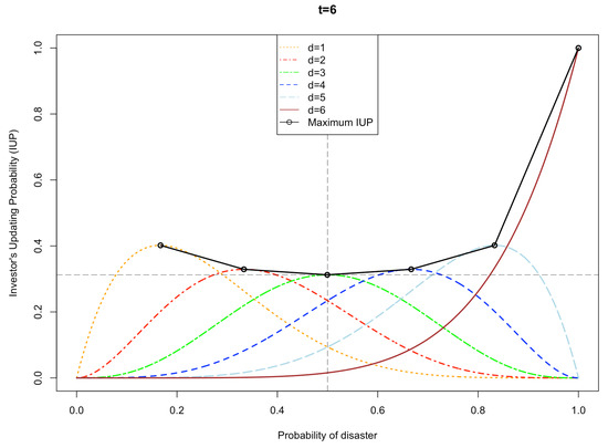 Simulated investors’ updating probability: this figure shows simulated IUP after six months , with the possibility of different numbers of Disaster states, d.
