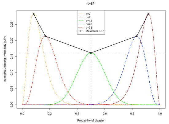 Simulated investors’ updating probability: this figure shows simulated IUP after two years , with the possibility of different numbers of Disaster states, d.