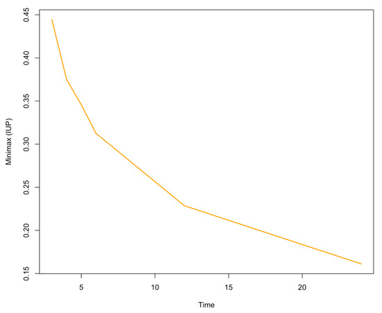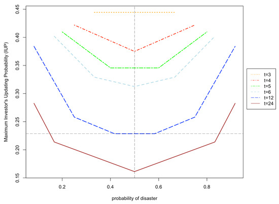 Moreover, the minimum of the maximum IUP is visualized in Figure 4, at the change point with the disaster probability . This figure clearly shows the downward trend over time, varying from 45 percent to 16 percent. This means that investors update their belief by at least 45 percent in the early period of a crisis. As time passes, even in the case of no changes in disaster probability, investors’ updating probability reduces to around 16 percent.