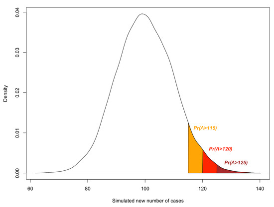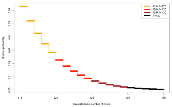 Disaster probability as a function of COVID-19 intensity, : this figure shows based on the simulated new number of cases.