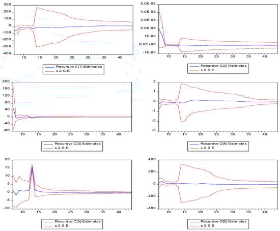 This study employed the Augmented Dickey–Fuller (ADF) and Phillips–Perron (PP) tests to assess stationarity and remove time series dependency in the variables (Dickey and Fuller 1979; Breitung and Franses 1998). The ARDL bound tests were utilized to evaluate the presence of a long-term equilibrium relationship among the variables (Alsulami and Raza 2025). Heteroscedasticity is identified through tests when the OLS assumption of constant variance of residuals across all observations is violated (Raza et al. 2023). Ramsey RESET tests were performed to assess omitted variable bias, indicating the presence of relevant variables (Ramsey 1969). Recursive coefficient estimates were employed to assess the long-term stability of the regression model (Belsley 1980).