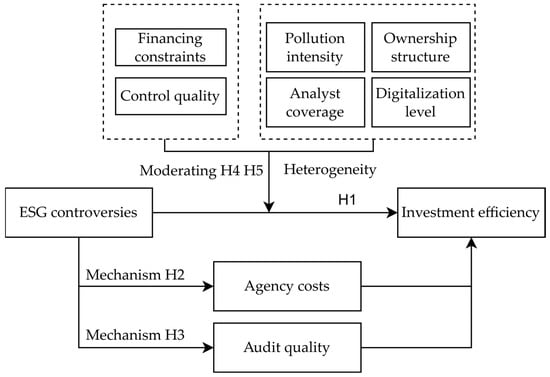 According to the agency theory, there is an asymmetry of interests between corporate management and shareholders, where management may make decisions that are not aligned with the best interests of shareholders based on their interests (Dharwadkar et al. 2000). ESG controversies often exacerbate agency costs, affecting a firm’s investment efficiency. When responding to ESG controversies, the goals and preferences of shareholders and management may diverge (Kakhbod et al. 2023). Shareholders may seek to enhance the firm’s long-term value through rational and efficient investment decisions. At the same time, management may be more inclined to adopt measures that can quickly restore the public image, leading to decision-making biases (Chen et al. 2024). Furthermore, additional regulatory pressure may force the firm to increase oversight costs on management, such as strengthening internal audits and compliance checks (Gou and Li 2025). The rise in agency costs leads to missed higher-return investment opportunities, thereby reducing investment efficiency (Liu et al. 2021). Based on the above analysis, the following hypothesis is proposed: