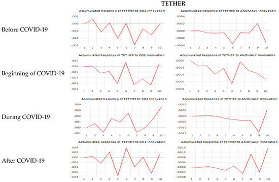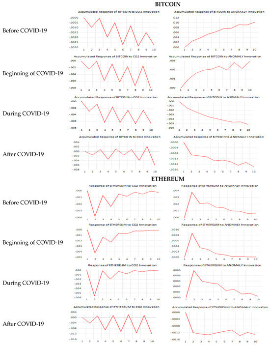 Before the crisis, Bitcoin returns exhibited a cumulative negative response to CO2 emissions, reaching approximately −0.0025 by period 10, indicating a negative impact. In contrast, temperature anomalies had a growing positive effect, reaching about 0.011, highlighting Bitcoin’s sensitivity to these variables. As the pandemic began, this trend persisted, with a more pronounced negative response to CO2 emissions (−0.0075) and a lesser positive effect from temperature anomalies (0.0025). However, during the crisis, both environmental factors negatively influenced Bitcoin, reaching approximately −0.006, showing an increased sensitivity to environmental disruptions. After the pandemic, the effects of CO2 emissions and temperature anomalies fluctuated but remained generally negative, underscoring the ongoing importance of these variables for Bitcoin investors.