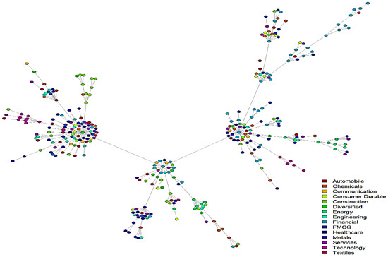 Using these weighted correlation coefficient matrices, undirected weighted stock networks were constructed, forming a graph with 335 edges representing stocks belonging to different industry sectors (Figure A1). This is a type of dense graph, and possesses 55,945 edges, wherein all vertices have N − 1 edge connections. The resultant weighted equity network can be described as follows: The vertices of the network represent the time series of the stocks’ log returns, and there is a weight wi,j associated with the edges between each pair (i,j) of nodes. Each of the 335 vertices of the weighted equity network model represents a time series of the log returns of the individual scripts of the selected 335 stocks. The weighted equity network construction is adopted from Kim (2002b). The complete weighted equity network, as shown in Figure A1, provides a holistic view of the interdependencies within the Indian market. It is very useful in understanding the overall market structure and in studying the correlations and portfolio constructions of the market. A highly connected network may represent potential channels of systemic risk flow. Identifying such potential nodes could be highly useful in dealing with the market’s stability and systemic risk. The next section covers the different network metric computations that were conducted to understand the overall market structure.