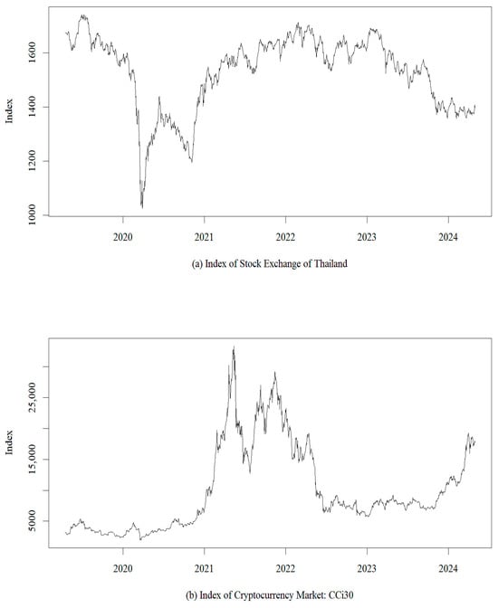 Based on data availability, and since the research context is in Thailand, the prices for Bitcoin and Ethereum are denominated in Thai Baht to reflect the situation in Thailand better. The cryptocurrency closing price data were sourced from Orbix (Satang), a leading cryptocurrency exchange in Thailand. The historical data for the CCI30 index were obtained from CCI30.com. All daily data for the Thai stock market indices are obtained from the Stock Exchange of Thailand (Stock Exchange of Thailand 2024b).