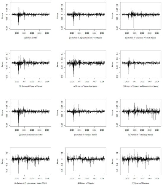 Table 1 and Table 2 demonstrate the relevant descriptive statistics. The mean returns of most stock market sectors in Thailand were approximately zero, except for the consumer products sector, which recorded a slightly negative mean return of −0.001. In contrast, all three cryptocurrencies exhibited positive mean returns, with Ethereum yielding the highest mean return of 0.003. These results suggest that, on average, cryptocurrencies outperformed the stock market sectors in terms of mean returns during the observed period. In terms of the standard deviation, for stocks, the standard deviation for all stock returns was around 0.010; for cryptocurrencies, the standard deviation of the Cryptocurrency Index, Bitcoin, and Ethereum were all above 0.040, and the standard deviation of Ethereum was 0.052, which was the highest among all other assets.