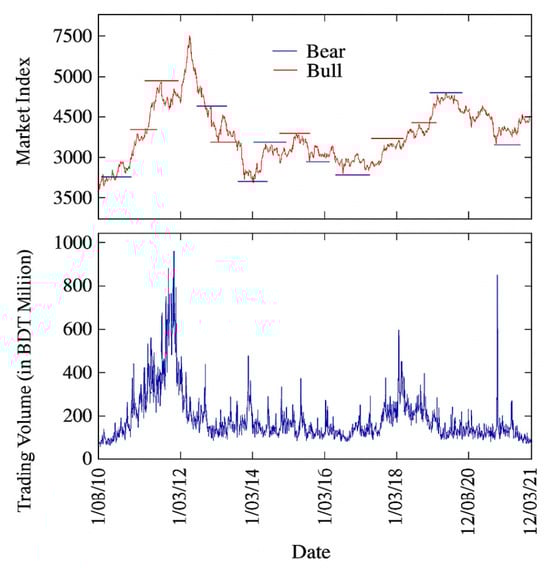 This section describes the dataset, including its key characteristics, followed by a methodological framework employed to examine the herding behavior in the Bangladesh equity market across various market states. The data used for the study include the daily closing prices and trading volumes of all companies listed on the Dhaka Stock Exchange (DSE) between 3 January 2010 and 30 December 2021. The data were sourced from the DSE library, which analyzes the annual trade information files. The study considers two variables: equity market returns (determined as the weighted average return of all listed companies) and market trading volume (determined by summing up the daily trade volume of all listed firms). We chose 290 companies, excluding mutual funds and bonds, for the analysis after addressing data issues like non-synchronized trading days and missing values.