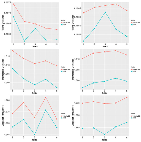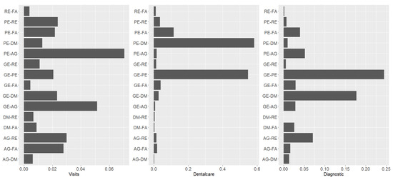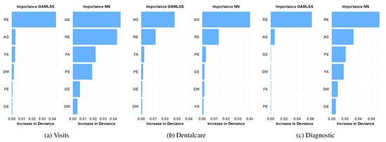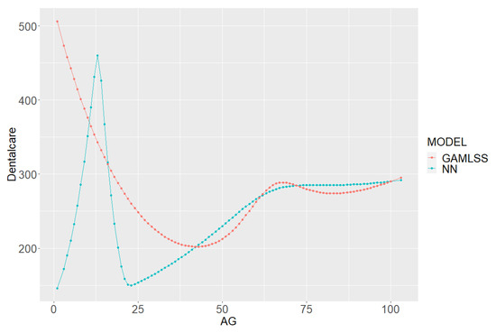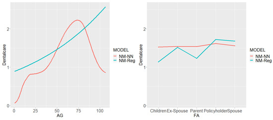 In the following lines, we analyze the marginal effect for the different covariates considered in the NMR and the NM-NN. In particular, we will discuss the marginal effect of some selected variables on the claim frequencies of medical visits, dental treatments, and diagnostic tests.