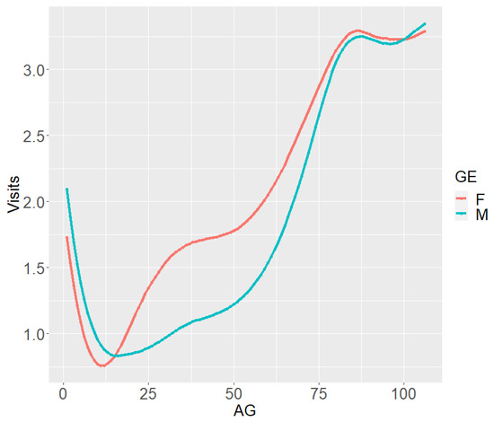 AG. Such a figure displays a different behavior for the age PD plot conditioned on females. In particular, we notice a higher claim frequency for female insureds between 20 and 60 years of age. This increased frequency is probably associated with gynecologic visits and pregnancy-related visits.