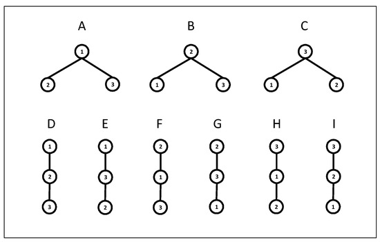 We consider the hierarchies shown in Figure 1. In each of the hierarchies A to C, one asset is at the top of the hierarchy and the other two assets are direct successors of this asset. In hierarchies D to I, the asset at the top of the hierarchy is directly followed by only one asset. The third asset is the direct successor to this asset. In addition, we assume four weight vectors with respect to the value and the value- -and random weights assuming a uniform distribution of between 0 and This broad approach, with all possible hierarchical structures on the set of three assets and a variety of weight vectors, allows for a detailed analysis of how hierarchies affect the correction of the low-risk puzzle.