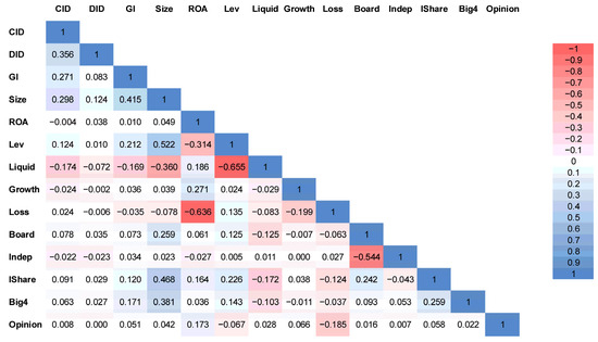Among the control variables, Size is moderately correlated with CID (r = 0.298) and DID (r = 0.124), indicating that larger firms are more likely to be subject to policy interventions and engage in voluntary disclosure. Lev exhibits a weak positive correlation with CID (r = 0.124) but a strong negative correlation with ROA (r = −0.314), reflecting the typical trade-off between financial leverage and profitability. Liquid is negatively correlated with CID (r = −0.174), Size (r = −0.360), and Lev (r = −0.655), which suggests that firms with higher liquidity ratios tend to be smaller and less leveraged.