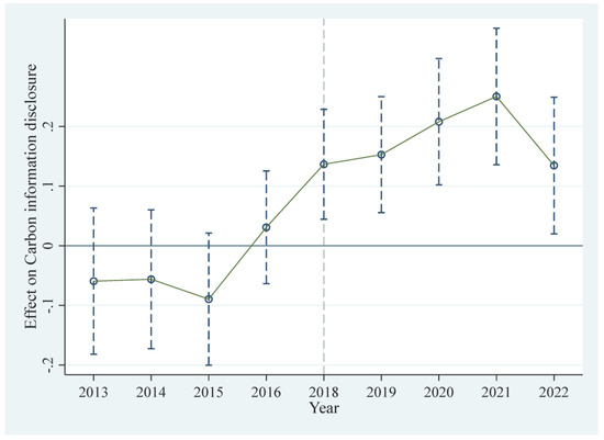 In order to ensure the validity of the difference-in-differences (DID) estimation, it is essential to verify the parallel trend assumption, which requires that before the policy intervention, the treatment and control groups followed similar carbon information disclosure trends. Figure 2 presents an event study analysis, plotting the estimated coefficients for the pre- and post-policy periods to assess whether the disclosure behaviors of treated and control firms were comparable before 2018.