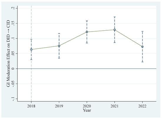 To evaluate Hypothesis 3 (H3), this paper investigates whether the moderating effect of green innovation varies over time. This paper incorporates a set of interaction terms between Treat, GI, and individual year dummies for each post-policy year. The model is specified as follows: