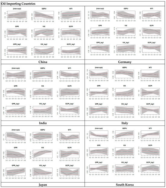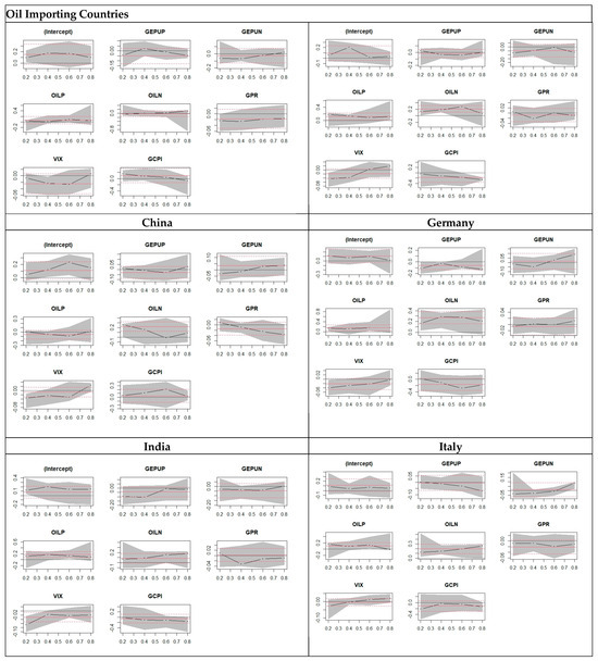 The results of oil-importing countries for asymmetric quantile regression are shown in Table 4. Where for the results of China, the GEPUp shocks show a decreasing trend, which shows that when GEPUp is at a high quantile, we can see lower market return, and when GEPUp is at a low quantile, we see higher market return. GEPUn shows an increasing trend, which indicates a higher market return at a high quantile and a lower market return at a low quantile. Coming to OILp (positive oil shocks), it shows a decreasing trend, which indicates a lower market return at high quantile and higher market return for lower quantile. Coming to OILn (negative oil shocks), an increasing trend is witnessed, which indicates a higher return at a higher quantile and a lower return at a lower quantile. In asymmetric quantile regression of Germany, the GEPUp shocks show a decreasing trend from 0.001 at the 0.2 quantile to −0.017 at the 0.8 quantile, which shows that when GEPUp is at a high quantile, we can see a low market return, and when GEPUp is at a low quantile, we see a high market return. GEPUn shows a decreasing trend. At the 0.2 quantile, GEPUn is −0.062, which shows that when GEPUn is at a lower quantile, we see a higher market return. At the 0.8 quantile, GEPUn is −0.072, which shows that when GEPUn is at a higher quantile, we see lower market return. Coming to OILp (positive oil shocks), it shows a constant trend moving from 0.079 at the 0.2 quantile to 0.079 at the 0.8 quantile, which indicates a lower return at a low quantile and higher market return for a higher quantile. Coming to OILn (negative oil shocks), an increasing trend from −0.025 at the 0.2 quantile to 0.152 at the 0.8 quantile is observed. This indicates a higher market return at a higher quantile and a lower market return at a lower quantile.