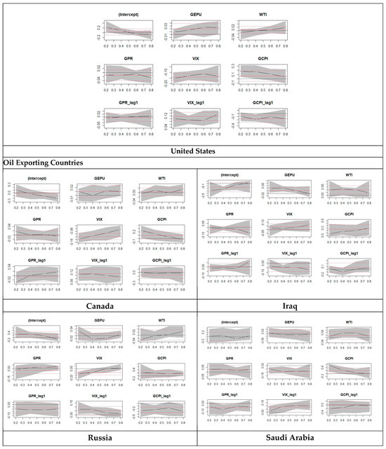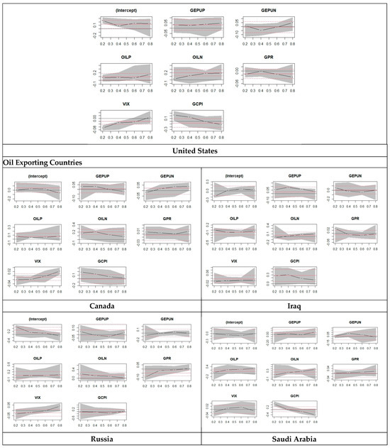 The results in Table 5 show that at the 0.20 quantile of Canada, the GEPU value is 0.023, which is highly significant, and is greater than −0.010 at the 0.80 quantile, which is also highly significant. For Canada, we can see that according to stock market returns, the GEPU shows a decreasing effect from 0.20 quantile to 0.80, and we witness the same for oil as well. It shows a decreasing trend from 0.041 at the 0.20 quantile to 0.042 at the 0.80 quantile, both values being highly significant. At the 0.20 quantile of Iraq, the GEPU value is 0.093, which is highly significant and is greater than −0.018 at the 0.80 quantile, which is also highly significant. For Iraq, we can see that according to stock market returns, the GEPU shows a decreasing effect from 0.20 quantile to 0.80. Oil shows a decreasing trend from 0.040 at the 0.20 quantile to −0.008 at the 0.80 quantile. Both of the values are insignificant, showing that it has no real effect. At 0.20 quantile of Russia, the GEPU value is 0.099, which is highly significant and is less than 0.028 at the 0.80 quantile, which is insignificant, showing no effect. For Russia, we can see that according to stock market returns, the GEPU shows a decreasing effect from 0.20 quantile to 0.80. Oil shows an increasing trend from 0.013 at the 0.20 quantile to 0.616 at the 0.80 quantile. Both of the values are highly significant, showing that it has an effect.