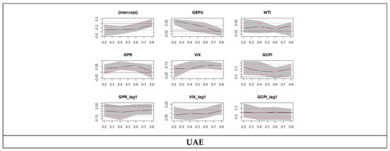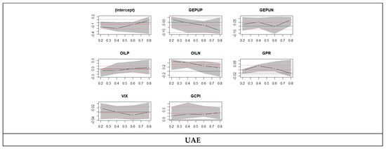At the 0.20 quantile of Saudia, the GEPU value is 0.019, which is insignificant and is less than 0.054 at the 0.80 quantile, which is significant, showing no effect. For Saudia, we can see that according to stock market returns, the GEPU shows an increasing effect from 0.20 quantile to 0.80. Oil shows an increasing trend from 0.025 at the 0.20 quantile to 0.295 at the 0.80 quantile. Both of the values are highly significant, showing that it has an effect. At the 0.20 quantile of UAE, the GEPU value is 0.051, which is more than −0.068 at the 0.80 quantile, both being insignificant and showing no effect. For the UAE, we can see that according to stock market returns, the GEPU shows a decreasing effect from the 0.20 quantile to the 0.80. Oil shows an increasing trend from −0.148 at the 0.20 quantile to 0.016 at the 0.80 quantile. Both of the values are insignificant, showing that it has no effect.