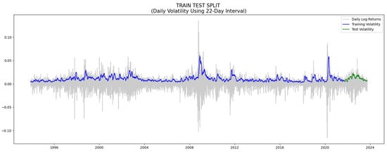 We used thirty years of daily S&P 500 data from Yahoo Finance, 1 October 1993 to 1 October 2023. We used the first twenty-eight years for training and the last two years for testing, as shown in Figure 2. The actual training data (3 December 1993 to 28 September 2021) is slightly shorter than twenty-eight years because of data loss when processing data and calculating rolling returns. We calculated the realized volatility as the annualized standard deviation of 22 rolling trading days’ (as an approximation for one month in time) log return. We also tried 11 trading days (approximately 15 days), and the RMSPE for GARCH and IV are relatively stable but nearly doubled for the transformer and tripled for LSTM, at 0.10 and 0.14, respectively. The logarithmic return for a given day t is represented as follows: