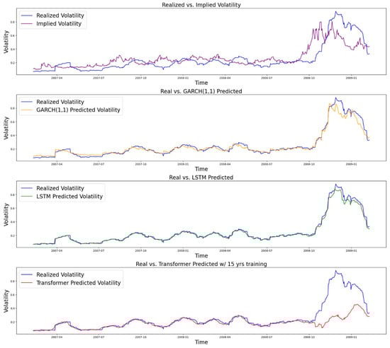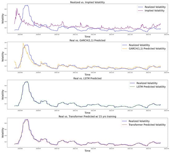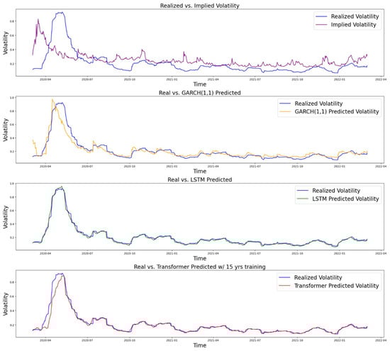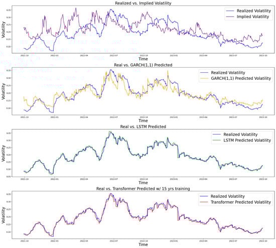 Volatility cannot be observed; therefore, it has to be estimated, which is why we embark on this journey to survey different volatility models. There are various ways that researchers have used to estimate volatility; the two most common ones are realized volatility, which is the annualized standard deviation of log returns, and implied volatility, which is a forward-looking metric calculated from options. While the Black–Scholes model as the basis of implied volatility has unrealistic assumptions, it is based on actual market data and has been a standardized way of quantifying volatility. In this paper, we choose realized volatility as our prediction target and use implied volatility as one of the ways to predict it. Other than implied volatility, researchers have employed a wide range of other models, ranging from traditional Generalized Autoregressive Conditional Heteroskedasticity (GARCH) (Bollerslev 1986) to Neural Network frameworks such as Long Short Term Memory (LSTM) (Hochreiter and Schmidhuber 1997) and transformers (Vaswani et al. 2023). In this paper, we compare the relative performance of these models, showing how machine learning models have significantly outperformed earlier ones, while also discussing the limitations of these models, some of which are hard to interpret intuitively.