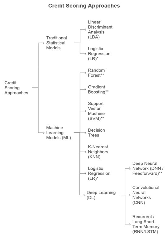 Credit Scoring Approaches. *—Often used as ML baseline. **—Model evaluated in this study.