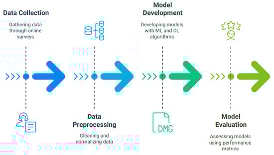 This research adopts a quantitative design comprising four main stages as visualized in Figure 2. First, primary data were collected through online surveys targeting university students. Second, the dataset was preprocessed through cleaning, encoding of categorical variables, and normalization to ensure consistency across features. Third, predictive models were developed using selected ML algorithms—Random Forest, Gradient Boosting, and Support Vector Machine—as well as a DL model implemented with PyTorch. Finally, model performance was evaluated using standard metrics, including Accuracy, Precision, Recall and F1-Score.