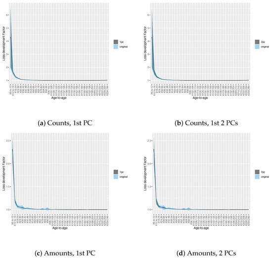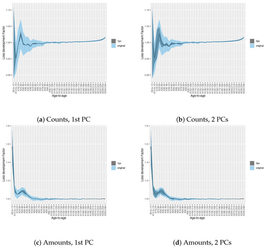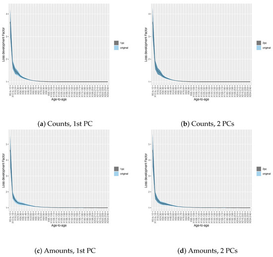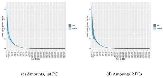 In the plots of Figure 1, Figure 2, Figure 3 and Figure 4, the blue and grey shaded areas represent the variability of DFs across different accident years. Notably, PCA reduces the width of these intervals, particularly when using only the first PC, indicating enhanced precision in the DF estimates. This improved accuracy can support insurers in making more informed loss reserving decisions, contributing to better financial planning. From a practical standpoint, these findings suggest that PCA can effectively filter noise and highlight the dominant trend in the development patterns, which in turn enhances the reliability of reserve estimates. For insurers, this translates to more accurate and consistent reserving practices, ultimately supporting better capital management, pricing strategies, and regulatory compliance.