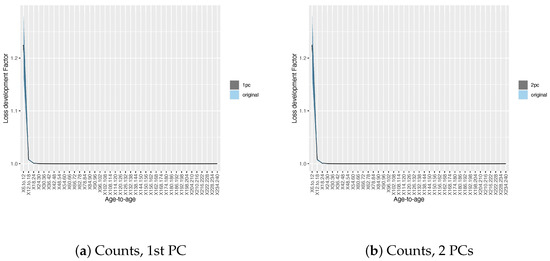 Principal Component Analysis is conducted to examine whether a small number of principal components (PCs) can effectively reduce noise while retaining the primary variability in LDFs. Figure 1, Figure 2, Figure 3 and Figure 4 present the LDFs for incurred and paid counts and losses across all development ages, for both bodily injury (BI) and medical coverages. These factors are estimated using either one or two PCs.