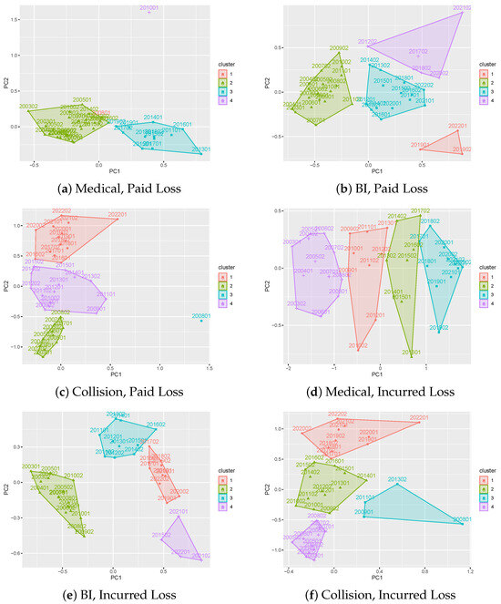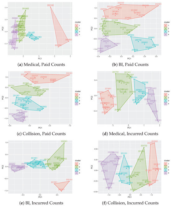 Figure 5 and Figure 6 display the first two PC scores of LDFs for incurred and paid counts and losses across medical, BI, and collision coverages. Colors represent the clusters determined using traditional K-Means clustering, while the numbers correspond to accident half-years. Interestingly, the clustering results for paid and incurred losses (Figure 5) show that cluster membership is not strictly determined by accident year. For instance, in BI coverage, the second halves of 2012, 2017, and 2020 form one cluster, while the first halves of 2013, 2016, and 2022 form another. Similar observations are made across other coverages. However, the development factors are inherently time sensitive. For example, LDFs from adjacent accident half-years may be expected to be similar, and DFs after 2019 may exhibit distinct characteristics due to the COVID-19 pandemic. To account for such temporal dependencies, we integrate accident year contiguity into our clustering approach as described in Algorithm 1.