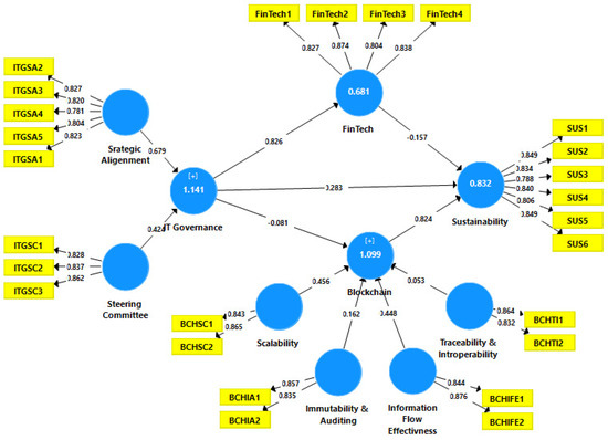 The results in Table 6 and Figure 3 provide an estimation of structural equation modeling for the effect of fintech, IT governance, and blockchain on mitigating organizational risks and sustainability performance in Oman. The analysis results indicate that IT governance has an insignificant effect on sustainability (β = −0.196, t = 0.818, p-Value = 0.414 > 0.05). Surprisingly, the results indicate that IT governance has a negative effect on sustainability. This means that the respondents perceive that the current IT governance practices are not aligned with sustainability practices. Further, the lack of a significant relationship between IT governance and sustainability could indicate that, while IT governance is crucial for improving technical and organizational procedures, some firms did not directly convert IT governance procedures into tangible sustainability practices. Notably, the results also reveal that both dimensions of IT governance, the strategic alignment (β = 0.059, t = 0.442, p-Value = 0.658 > 0.05) and steering committee (β = 0.037, t = 0.430, p-Value = 0.667 > 0.05), have an insignificant effect on sustainability. This could indicate that the respondents perceive a weak strategic alignment of sustainability practices with their current organizational practices. Similarly, the lack of a significant relationship between the steering committee and sustainability implies that the steering committee’s impact on sustainability is limited or indirect. This could be attributed to the need for more collaboration between the steering committee and executive teams to achieve sustainability goals. The results contradict (Almaqtari 2024a, 2024b; Almaqtari et al. 2022), who indicate that IT governance contributes to the sustainability of business organizations. Similarly, de Haes and van Grembergen (2009) and Vugec et al. (2014) suggest that companies should prioritize aligning business strategy with IT governance to achieve sustainability.
