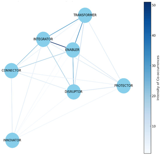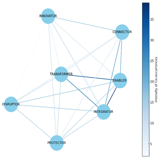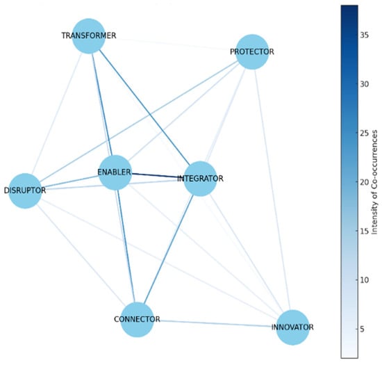 For this reason, analyzing network metrics provides valuable insights into the strategic functions of InsurTech archetypes within the evolving digital ecosystem. As illustrated in Figure 3, which visualizes the intensity of co-occurrences between archetypes based on the final sample of 364 active InsurTech firms, the Facilitator and Integrator archetypes emerge as the most structurally influential. These two archetypes exhibit the highest degree of eigenvector centrality values, indicating their high level of connection and strategic positioning at the core of the ecosystem. They act as the technological and infrastructural backbone, enabling other archetypes to operate efficiently by facilitating integration, data flow, and digital capabilities. In contrast, Disruptors and Protectors occupy more peripheral roles, contributing specialized functionalities. Their presence, although not central, adds resilience to the overall structure of the ecosystem. Although not as dominant as the Enablers or Integrators, the Connectors show intermediate centrality values and play a crucial role in bridging the gap between customer-facing functions (such as Innovators) and more platform or operation-based capabilities (such as Transformers). Their positioning highlights the importance of access, distribution, and market interface within a digitally enabled insurance environment. Therefore, the properties of the network and the visual structure confirm that the formation of the ecosystem is not random but is shaped by strategic interdependencies as certain archetypes emerge as structural axes in the orchestration of collaborative dynamics.
