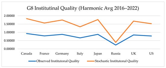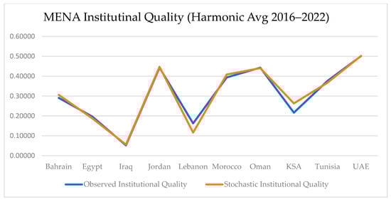 Figure 1 and Figure 2 illustrate the empiricism of institutional quality. That is, what distinguishes developed countries from developing countries is an increasing improvement in institutional quality. In the case of G8, Figure 1 shows that the expected (stochastic) average WGI is greater than that observed in every country. In contrast, Figure 2 shows that the expected (stochastic) averages of WGIs are very close to the observed averages, illustrating a slow pace of improvement in institutional quality in MENA countries.