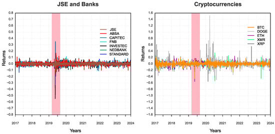 Stock prices (in black) and returns (in gray) for JSE, banks, and cryptocurrencies.