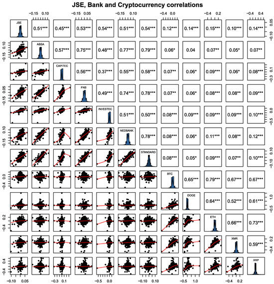 JSE, bank, and cryptocurrency correlations based on Spearman’s rho (ρ) correlation measure. In the absence of a normal distribution, Pearson’s correlation measure would be inadequate, and Spearman’s correlation is the suitable measure for correlation. (*), (**) and (***) correspond to 0 < p ≤ 0.001, 0.001 < p ≤ 0.01, and 0.01 < p ≤ 0.05, respectively, where p are the p-values.