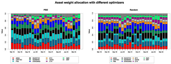 The objective of minimizing risk and maximizing the return of the portfolio, or portfolio optimization, involves the selection of asset weights that result in the highest risk-adjusted return as measured by the Sharpe ratio. The weights shown in Figure 3 show that cryptocurrencies tend to be allocated more weight during the crisis period of January 2020 to June 2020 and less weight in the calmer market periods. This is an indication that during a short crisis period, cryptocurrencies will boost portfolio performance if added to the portfolio. In addition, compared with the random optimizer, the PSO optimizer appears to allocate more weight to cryptocurrencies when compared with the random optimizer. This means that portfolios where the PSO optimizer is used are more diversified.