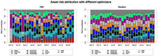 Asset risk attribution by the PSO and random optimizers with constraints, , , and a box constraint where min = 0.05 and max = 0.4 to avoid concentrated portfolios.