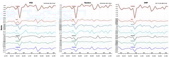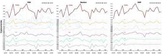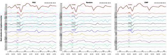 Asset return contributions to the portfolio, on the other hand, are shown in Figure 5, Figure 6 and Figure 7 for bank-only, cryptocurrency-only, and a combination of bank stock and cryptocurrency portfolios. In the bank stock-only portfolio in Figure 5, the PSO, random, and EWP methods show that during the major crisis of 2020, the biggest contributors to portfolio losses were Investec, Capitec Bank, Nedbank, Standard Bank, and the smallest contributors to portfolio losses were FNB and ABSA for all optimizers. Higher portfolio gains and losses were captured by PSO and random optimizers compared with the EWP. In the periods beyond the 2020 crisis, the performance of all optimizers was identical.