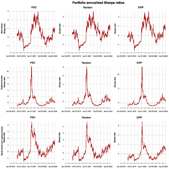The dynamic portfolio performance metrics of the annualized Sharpe ratios we provide in Figure 8 show that the bank stock-only portfolio experienced its worst performance in the first six months of 2020, after which there was a tremendous recovery until the beginning of 2022 for all methods. For the cryptocurrency-only portfolio, there was a slight decline, coupled with a much bigger recovery compared with bank stocks for all methods. But this performance only lasted until July 2020. Thereafter, the portfolio of cryptocurrencies experienced an immense decline in performance for all methods. The portfolio of cryptocurrencies and bank stocks has a performance that replicates that of cryptocurrencies more and less of bank stocks. This is observed more with the EWP compared with the PSO and random portfolio optimizers.